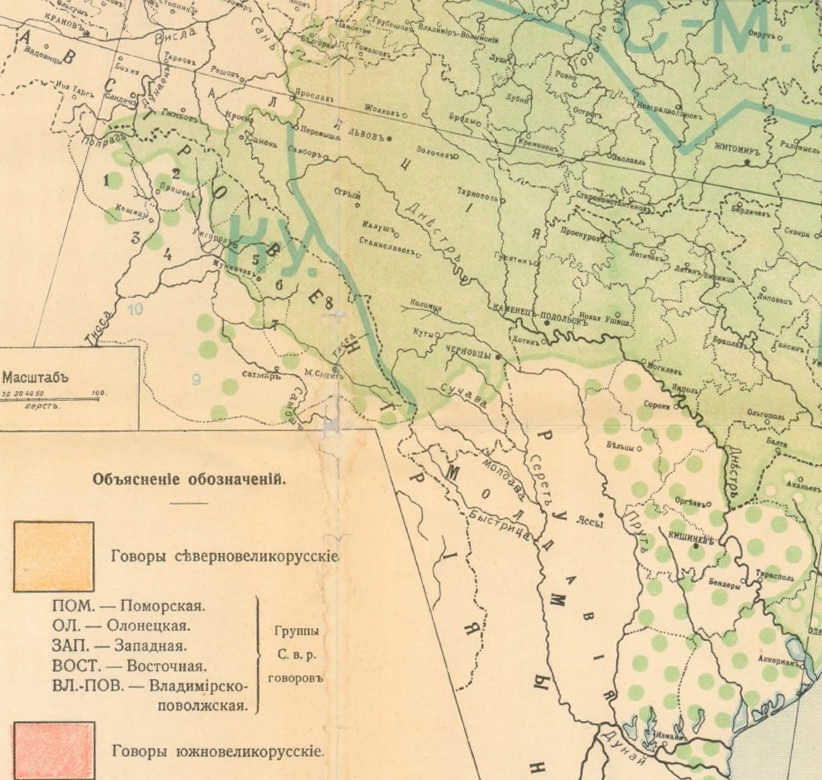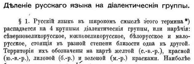 Илл. 4. Карта. Объяснение обозначений. Глава «Деление русского языка на диалектические группы.» в § 1 сообщает: «Русский язык в широком смысле этого термина *) распадается на 4 крупные диалектические группы или наречия: северновеликорусское, южновеликорусское, белорусское и малорусское, стоящие в разной степени близости друг к другу. …» (илл. 5).
