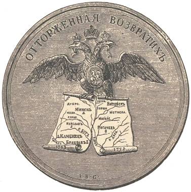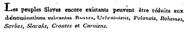 Илл. 4. Медаль «Отторженная возвратихъ». Ещё недавно безраздельно господствовавшая в западных пределах России польская шляхта потеряла возможность открытой вооружённой борьбы с русским государством. Поэтому паны развязали войну за новое государственно-политическое отторжение Западной России от Восточной на идеологическом фронте, в сфере идей. Первым украинско-сепаратистским продуктом польских науко-идеологов исследователи обычно называют изданную на французском языке книгу Яна Потоцкого (Jеan Potocki) «Исторические и географические фрагменты о Скифии, Сарматии и славянах», Т.I, 1796 г. [6]. В ней известное с конца XVI в. слово «украинцы», изначально обозначавшее обитателей юго-восточной окраины, Украины (Ukraina) Речи Посполитой независимо от их национальности, впервые прямо заявлено как этноним отдельного от русских народа. Книга открывается словами (с. 3): «Les peoples Slaves encore existants peuvent être réduits aux denomination suivantes Russes, Uckrainiens, Polonis, Bohemes, Serbes, Slavaks, Croates et Carniens.» – «Существующие славянские народы можно свести к следующим (подразделить на следующие) – русские, украинцы, поляки, богемцы (чехи), сербы, словаки, хорваты и карнийцы (словенцы).» (илл. 5).