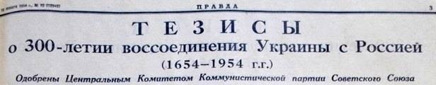 Илл. 8. Тезисы о 300-летии Воссоединения Украины с Россией. Правда. 12 янв.1954. С. 3. Фрагмент. Кстати, сам факт позднего появления концепции «древнерусской народности» и связанных с нею советских вариантов мифов «Москва (Московия)-Россия» и «Украина (Белоруссия) - не Россия» только в середине ХХ в., спустя десятилетия после создания Лениным и Ко квазигосударств РСФСР, УССР, БССР и Союза ССР, говорит об исполнении советскими науко-идеологами партийного заказа задним числом. До этого существование названных этно-политических образований не имело «общепринятого» «научного» обоснования и расчленение русского народа насаждалось голимой тоталитарно-диктаторской политической практикой партии Ленина-Сталина. В декабре 1991 г. «демократическая» часть коммунистической партноменклатуры привела в действие заряженную в 1922 г. Лениным со товарищи бомбу договора об образовании СССР (его п. 26 давал право выхода республик из Союза). Партийно-советские функционеры расположенных на земле исторической России главных квазигосударств-соучредителей Советского Союза, РСФСР, УССР и БССР (в лице их Верховных Советов), денонсировали союзный договор, а Ельцин, Кравчук, Шушкевич подписали печально известное Беловежское соглашение. Подлинное преступное значение этих документов, по форме прекративших существование государства СССР, заключается в том, что они юридически оформили расчленение нашей страны Руси-России и русского народа между тремя созданными коммунистами государствами - Российская федерация (РФ), Украина, Белоруссия. Само существование этих трёх взаимно самостiйних i незалежних (укр.), сепаратистских государств - это гарантия продолжающегося расчленения нашей страны Руси-России. Такова страшная, раздирающая на части Русскую землю, суть заложенного Лениным в 1922 г. польско-украинского (и белорусского) большевистского проекта СССР и пост-СССР, поныне воплощаемого его продолжателями в Москве, Киеве и Минске.
