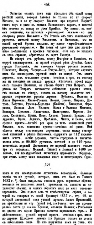 Илл. 3. Д.И. Зубрицкий. Границы между русинскою и польскою нациями в Галиции. 1864. С. 90-118. К XXI в. от Завислоцкой Руси, от крайне-западных русских поселений, ранее веками сохранявшихся в соседстве с поляками, осталась беззвучные свидетельства: документы, воспоминания, исследования историков, уцелевшие архитектурные памятники и надгробия кладбищ. В 1944-1947 гг. польская власть с подачи бандеровцев, использовавших местных жителей, которых они называли украинцами, как ресурсную базу (отнюдь не всегда добровольную), зачистила эти земли от коренного русского народа. Вместе с советскими коммунистами часть депортировали в УССР в рамках соглашения по «обмену населением», частью насильственно переселили в северные и западные области Польши (операция «Висла»). Сегодня среди осовеченных и украинизированных коммунистами потомков русских людей мало кто знает о печальной судьбе Лемковщины, Завислоцкой Руси. Выращенное на шляхетских шовинистических мифах очередное поколение польских русофобов считает нормой опрокидывать на Россию грехи собственных горе-патриотов — обвинять в захвате земель других народов и стран. Зачищенная поляками с санкции большевиков от коренного русского населения Завислоцкая Русь, как и более восточная русская Холмщина, - горький укор польской совести, точнее, для тех из поляков, у кого она не выжжена русофобским шовинистическим угаром (много ли таких?). Ожидаемое польское оправдание, что дескать эти зачистки спровоцированы бандеровским террором, на самом деле является ещё одним обвинением против ляхов. Ведь именно польская иезуитски-воспитанная шляхта в своё время породила идеологию украинства и служила генератором кадров украинского сепаратизма, привившим ему родовые сатанинские свойства - ложь, ненависть, беспощадность, жестокость, следствие которых - массовые убийства «врагов». Ценность наследия Д.И. Зубрицкого, конечно же, невозможно и незачем сводить к отпору полякам (или их украинским ученикам), хотя некоторые его работы и написаны в ответ польским притязаниям. Труды Дионисия Ивановича самоценны как важные исследования по галицко-русской истории, как поныне насущные действительно научные свидетельства русскости Галицкой земли, русскости её коренных жителей. В таковом качестве его имя и труды необходимо как можно шире популяризировать и увековечивать по всей Руси-России. Имя великого сына Галицкой земли Д.И. Зубрицкого должны носить улицы и площади русских городов, ему должны быть установлены памятники, его имя и научная биография хотя бы вкратце должны преподаваться согласно программам истории учащимся будущей действительно русской (не советской, ныне переименованной в «российскую») средней и высшей школы. Необходимо перевести на русский и публиковать изданные на польском работы учёного. К сожалению, мы видим сейчас диаметрально иное - имя и труды Д.И. Зубрицкого преданы забвению. В древнем русском городе Львове вместо памятника этому выдающемуся учёному-историку, где он жил и трудился многие годы, воздвигнут памятник науко-идеологу М.С. Грушевскому, воспроизводившему в своей «Истории Украины-Руси» и прочих «наукових працях» мифы польской украинской сепаратистской идеологии. Памятник Грушевскому так же «украшает» первую общерусскую столицу, мать городов русских Киев, стоят таковые и в прочих