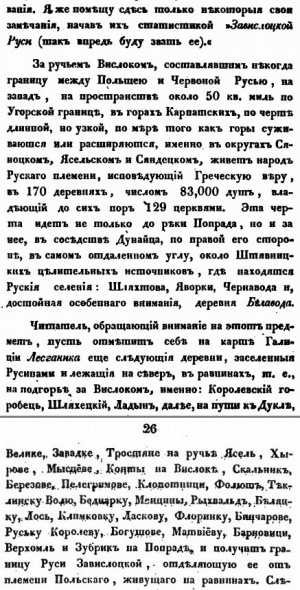 Далее Зубрицкий ставит вопрос о происхождении жителей Завислоцкой Руси и даёт ответ: «эти карпатские, завислоцкие русины – не поселенцы, а первобытный, туземный народ, обитавший там в отдаленнейшие времена, до покорения Руси Казимиром Великим.» [20]. На следующих страницах историк приходит к выводу, что изначально определило и далее сохранило русскость, русский язык народа Завислоцкой Руси, никогда не входившего в государство Рюриковичей, это – православная христианская вера «по обрядам греческим, из рук паннонских проповедников, посланных св. Кириллом и Мефодием» [21]. Денис Иванович вновь возвращается к вопросу этнографической границы между русскими и поляками в работе 1848 г. «Granice miedzy Ruskim i Polskin Narodem w Galiyi» (пол.), она же - «Gränzen zwischen der russinischen und polnischen Nation in Galizien» (нем). Русский перевод статьи переиздан в 1864 г. в «Вестнике Юго-Западной и Западной России» с названием «Границы между русинскою и польскою нациями в Галиции» [22]. «Русинская нация» в заглавии - перевод с немецкого издания, где вместо обычного немецкого «руссишен» - russischen (русской), значится «руссинишен» - russinischen (русинской). В заглавии польского издания того же года значится древнее, идущее из средневековья, «руским» - «Ruskim». Денис Иванович использовал этнонимы «русин, русины» и «русский, русские» как равнозначные - это видно по соответствующему словоупотреблению в его работах, включая данную. А в примечании к ней, про вышедшую в 1845 на русском литературном языке «Критико-историческую повесть временных лет …», историк прямо указывает, что она издана «на русинском языке» [23]. В статье «Границы между русинскою и польскою нациями в Галиции» автор увеличивает число приводимых исторических свидетельств о доходящих почти до Кракова крайних западных пределах расселения русского народа, упоминает ранее открытую им Завислоцкую Русь и вновь сообщает названия русских селений, статистику, уточняет их географию; цитируем. «Вышеприведенные свидетельства дают нам неоспоримые доказательства, что не река Вислок, как мы прежде утверждали … но река Вислока, начиная от ее истока, и если не до самого впадения в Вислу, то, по крайней мере, до окрестностей города Бжостына, образует натуральную границу между галицко-русским королевством с одной стороны, и герцогством краковским и сандомирским, или впоследствии так называемой Малою Польшею с другой. … Из того, что мы выше говорили, выходит, что вся восточная и северная земля, простирающаяся от означенной границы, есть русская, а не польская, и что на ее неизмеримых равнинах, то там, то здесь находятся разбросанные колонии или – фамилии поляков-иностранцев, которые населились здесь с 1340 г. Что и требовалось доказать. Остается сказать нам еще несколько об одной части русской земли, которая тянется не только по ту сторону Вислока, но и по ту сторону Вислоки, при подошве Карпатских гор и даже в самых Карпатских горах, и тянется от востока к западу до реки Дунайца. Эту землю, в своем сочинении мы называли «русинскою землею по ту сторону реки Вислока». В отличие от так называемых русских жителей между Вислоком и Вислокою, мы на всякий случай будем называть эту землю «прибескидскою русинскою страною». Мы даем ей одно имя для легчайшего соображения и просим читателя, если он не знаком с этой страною, обратиться к карте Галиции. На севере от рубежа между Ве
