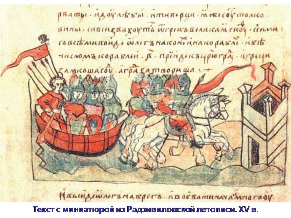«Доселе одни словесные предания могли руководствовать Нестора; но желая утвердить мир с Греками, Олег вздумал отправить в Царьград Послов, которые заключили с Империею договор письменный, драгоценный и древнейший памятник Истории Российской, сохраненный в нашей летописи. Мы изъясним единственно смысл темных речений, оставляя в целости, где можно, любопытную древность слога.