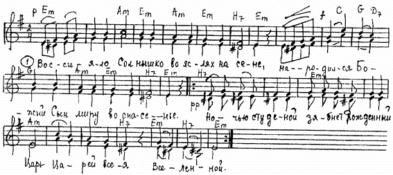 Я принес Тебе, Дитя, Ну, а я несу немножко Ну, а я Тебе несу С.Черный, рождественское стихотворение "В яслях спал на свежем сене…" 1. В яслях спал на свежем сене 2. Бык дохнул в лицо Младенца 3. Воробьи сквозь жерди крыши 4. Пес, прокравшись к теплой ножке, 5. Присмиревший белый козлик 6. "Посмотреть бы на Ребенка 7. А Христос, раскрывши глазки, Стихотворение Иоанна Рутенина "Зима. Рождество". Мама елку украшает, Снег пушинками кружится Старший хор. Песня "Воссияло солнышко".