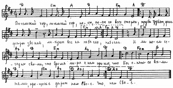Славят на небе ангельские хоры, Злые духи жалобно плачутся в пустыне, Ты, Мария-матушка, радости причина, - Стихотворение "Того, Кто вечно был и есть…" (В. Шидловский). Того, Кто вечно был и есть, И пастухи спешат с холма, Стихотворение "Ныне совершилось чудо из чудес…" Ныне совершилось чудо из чудес: Младший хор поет песню "Ангельский хор"