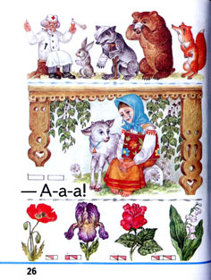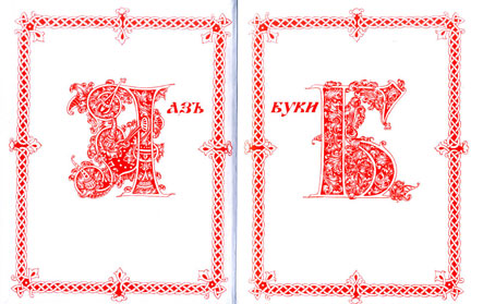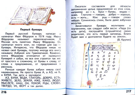 Откроем форзац учебника, и мы видим необыкновенно яркие большие, украшенные растительным орнаментом буквы А и Б, а рядом их старые названия «азъ»