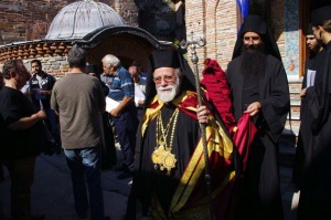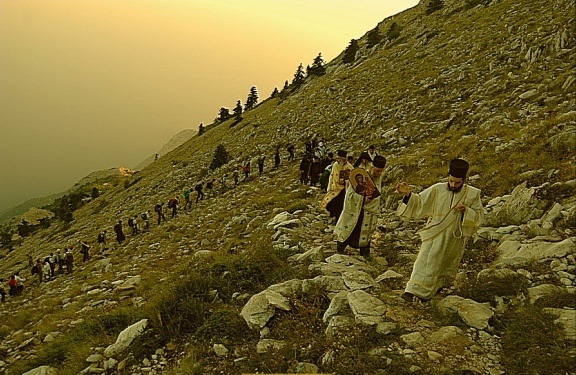 Как известно, на Востоке к началу августа поспевают злаки и виноград, которые христиане приносят в храм для благословения в знак благодарности Богу за дарование этих плодов. По древней традиции освящение плодов в день праздника Преображения приобрело особое символическое значение. Как говорит игумен русской святогорской обители схиархимандрит Иеремия (Алехин), в Преображении показано то новое, преображенное и благодатное, состояние, которое человек и мир обретают Воскресением Христа, и вся природа теперь вместе с человеком ожидает грядущего обновления. На день Преображения Господня престольные праздники (панигиры) были торжественно отмечены в афонских монастырях Кутлумуш и Пантократор, где соборные храмы посвящены Преображению Христову. В частности, праздничное богослужение в Преображенском соборе Кутлумушской обители возглавил митрополит Лампсакийский Макарий (Константинопольский патриархат). Прошли праздничные богослужения и в древней хиландарской обители Преображения Господня (келлия «Патерица»), расположенной неподалеку от столицы Афона – Кареи. Литургию здесь возглавил игумен сербского монастыря Хиландар архимандрит Мефодий. Торжественное богослужение в честь Преображения Господня прошло и на самой Вершине Святой Горы. На Афоне издревле соблюдается обычай в этот день восходить на Вершину, на высоту 2033 метра над уровнем моря, для совершения здесь всенощного бдения и литургии. По слову архимандрита Емилиана Симонопетрского, «эта вершина занимает особое место в сердцах святогорцев. Они видят в ней ось земли, соединяющую небо и землю, некий столб, по которому молитвы поднимаются к Богу, некое подножие престола Божьего, избранное жилище Всецарицы, "Матери света"». Именно здесь в X веке, в день Преображения, ктитор Иверского монастыря, преподобный Евфимий, увидел Божественный свет, блистающий, словно горящий огонь, в час, когда он служил литургию. Четырьмя веками позже здесь же Богородица явилась святому Максиму Кавсокаливиту, окруженная ярким светом и благоуханием, держащая на руках Господа, Который благословил святого Максима и наполнил его святым ликованием. На этом месте Божия Матерь неоднократно являлась многим святогорским подвижникам и даже паломникам. На Вершине Святой Горы возвышается небольшой храм в честь Преображения Господня, построенный в XIX в. стараниями Русского на Афоне Свято-Пантелеимонова монастыря, а за алтарной частью храма, на самой высокой точке Афона, стоит массивный железный крест высотою в четыре метра, установленный русскими иноками и паломниками в 1882 году. «Маленькая часовня Преображения и находящийся рядом с ней высокий железный крест, стоящие на этой тесной скале, обладают особенной символикой и показывают небу и земле две характерные составляющие монашеской жизни: переживание Креста, добровольное и непрестанное участие в Страстях Господних, являющееся одновременно и путем обожения, и жизнь в свете эсхатологической славы, которую Христос некогда открыл апостолам на горе Фавор. Как Господь поднялся на гору с избранными учениками, чтобы помолиться (Лк. 9:28), так и монахи, отрекшись от мира, живут на Афоне в тишине и молитве, живут здесь и сейчас, в свете Преображения. Афон для них – Фавор, прообраз Царства Небесного» (архим. Емилиан). Поэтому каждый год на Преображение Господ