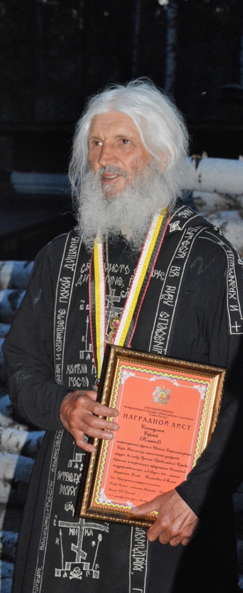 Высокой православной награды о. Сергий был удостоен "За многолетние усердные труды во славу Русской Православной Церкви, верность историческим традициям Российской имперской государственности, и в связи с 400 - летием воцарения Дома Романовых в России". Орден подписан заместителем председателя Наградного Комитета Игорем Смыковым. В 2008 г. к 140-летию со дня рождения Государя Императора Николая Второго по инициативе и трудами Войсковой Православной Миссии совместно с Наградным Комитетом ордена «Слава России» по благословению блаженнейшей памяти Первоиерарха Русской Православной Церкви Заграницей митрополита Лавра, был учрежден Орден «Святой Страстотерпец Царь Николай». Орден «Святой Страстотерпец Царь Николай» является международной церковно – общественной наградой. Среди кавалеров Ордена – Его Святейшество Патриарх Московский и Всея Руси Кирилл, Первоиерарх РПЦЗ митрополит Иларион, ряд видных иерархов РПЦ МП, среди них: митрополит Санкт - Петербургский и Ладожский Варсонофий, митрополит Владивостокский и Приморский Вениамин, митрополит Екатеринбургский и Верхотурский Кирилл, митрополит Ташкентский и Узбекистанский Викентий, митрополит Воронежский Сергий, митрополит Липецкий и Елецкий Никон, митрополит Черногорский и Приморский Амфилохий, наместник Московского Сретенского монастыря епископ Егорьевский Тихон, схиархимандрит о. Илий (Ноздрин), Его Королевское Высочество Кронпринц Югославии Александр Второй Карагеоргиевич, правнук Эрцгерцога Франца Фердинанда Его Светлость Князь Лео фон Гогенберг, Ольга Николаевна Куликовская-Романова, всемирно известные кинорежиссеры Эмир Кустурица, Никита Михалков, Николай Бурляев, народный артист России Александр Михайлов, православные историки и писатели Александр Боханов, Борис Галенин, Юрий Воробьевский, Алла Дьякова, Петр Мультатули, Альфред Мирек, Сергей Фомин, великий русский художник Павел Рыженко, путешественник-миссионер протоиерей Федор Конюхов, известные тележурналисты Аркадий Мамонтов и Елена Козенкова, ряд представителей православного духовенства и православно - монархической общественности, среди которых видное место занимают Любовь Васильевна Родионова - мать рядового Пограничных войск России Евгения Родионова, казнённого в 1996 г. чеченскими сепаратистами за отказ изменить Присяге и Православию, и с тех пор почитаемому многими православными как святой мученик, Председатель Общества развития русского исторического просвещения "Двуглавый орел" Леонид Петрович Решетников, генеральный директор Института экономических стратегий Александр Иванович Агеев, и глава Союза Православных Хоругвеносцев Леонид Донатович Симонович - Никшич. Главная цель Ордена - способствовать развитию монархического самосознания Русского народа, обретения правды о Государе Императоре Николае Втором Александровиче и Царской России, сохранение духовного, военного и культурного наследия Святой Руси и Российской Империи, укрепление традиционных духовно - нравственных ценностей. Девиз Ордена Святого Страстотерпца Царя Николая: "За верность Богу и Его Помазаннику". Схиигумен Сергий (в миру Романов Николай Васильевич, родился в 1955 году) — первый настоятель монастыря в честь святых Царственных Страстотерпцев на Ганиной Яме. Основатель и духовник Среднеуральского Женског