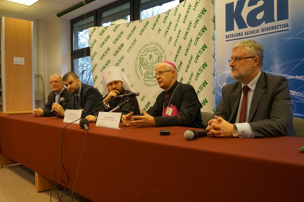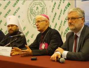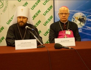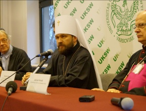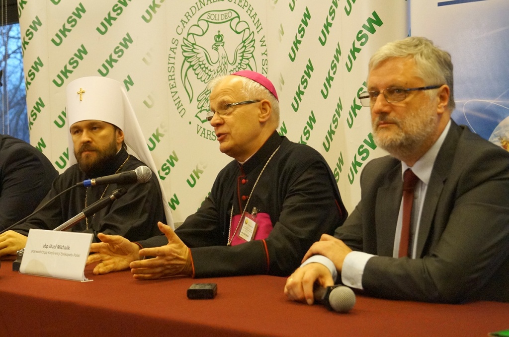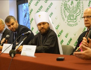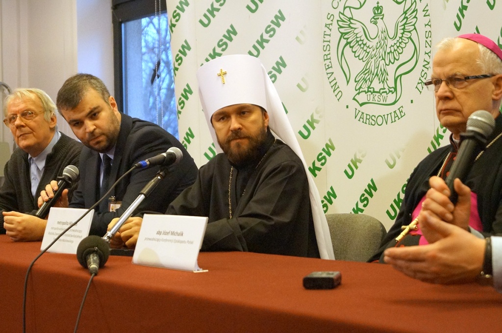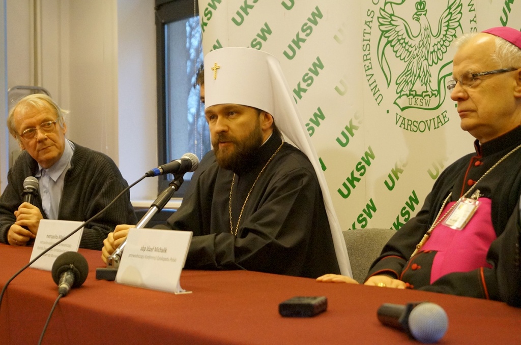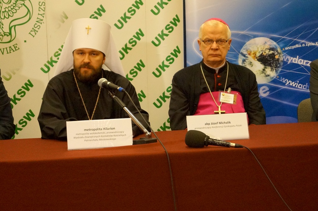 Митрополит Волоколамский Иларион: Не нужно закрывать глаза на темные страницы в книге истории России и Польши, но сейчас мы открыли и пишем в ней новы29 ноября 2013 года председатель Отдела внешних церковных связей Московского Патриархата митрополит Волоколамский Иларион и председатель Епископской конференции Польши архиепископ-митрополит Перемышльский Юзеф Михалик ответили на вопросы журналистов. Пресс-конференция прошла в Университете имени кардинала Стефана Вышинского в Варшаве, где в этот день открылась конференция «Будущее христианства в Европе: роль Церквей и народов Польши и России». Вопрос: Не могли бы Вы рассказать о роли Польской Православной Церкви в диалоге и примирении между Россией и Польшей? Митрополит Иларион: Я говорил об этом в своем докладе на конференции. Хотел бы отметить, что мы придаем очень большое значение участию Польской Православной Церкви в нашем диалоге, потому что Православие является неотъемлемой частью идентичности польского народа, в большинстве своем исповедующем католическую веру. Так и Россия − это страна, где большинство людей исповедует Православие, но в ней живут и христиане других конфессий, а также представители иных религий. Диалог этот задумывался, прежде всего, как диалог между Русской Православной Церковью как Церковью большинства в Российской Федерации и Польской Католической Церковью − как Церковью большинства в Республике Польша. Но с самого начала мы приняли решение, что в нем также должны участвовать Польская Православная Церковь и российские католики, потому что тема диалога − примирение между двумя народами, российским и польским и, следовательно, в нем должны участвовать все православные и католики наших стран. Вопрос: Насколько высоко понимание, осознание и осведомленность об этом диалоге среди православных верующих? Митрополит Иларион: Мы регулярно информируем наших верующих обо всем, что делаем. В Русской Православной Церкви существуют механизмы, при помощи которых все верующие (по крайней мере, все, кто желает, в том числе и среди мирян) вовлекаются в обсуждение вопросов, стоящих на повестке дня нашей церковной иерархии. Подписанное Святейшим Патриархом Кириллом и архиепископом Юзефом Михаликом Совместное послание к народам России и Польши прозвучало как здесь на всю страну, так и в России – тоже на всю страну. Это послание имело очень широкий резонанс, оно было прочитано в главном храме страны и транслировалось в прямом эфире российского телевидения, его обсуждению были посвящены телевизионные передачи, круглый стол в Государственной Думе Российской Федерации, целый ряд других мероприятий и встреч. Поэтому можно констатировать, что наш народ очень хорошо информирован о тех инициативах, которые предприняли наши Церкви. Вопрос: Каким вы видите будущее наших взаимоотношений, какие шаги могут быть предприняты в ближайшие месяцы и в ближайшие годы? Архиепископ Юзеф Михалик: На наш взгляд, диалог, который мы ведем уже не первый год, имеет, прежде всего, форму размышления, рефлексии и собеседования. С другой стороны, у него также есть и практическое измерение. Имеются конкретные примеры того, что мы можем делать − об этом сказал митрополит Иларион в своем докладе. И в Польше, и в России развиваются различные формы сотрудничества, в том числе молодежные дв