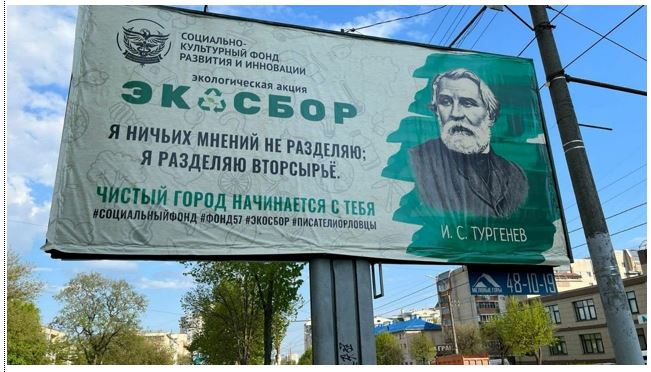 Совсем недавно на улицах Орла развесили баннеры, на которых призывы к сортировке бытовых отходов соседствуют с портретом Тургенева и выглядят так, будто написаны от имени классика мировой литературы: «Я ничьих мнений не разделяю; я разделяю мусор».