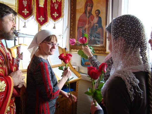 После окончания праздничного Богослужения в приходе святого страстотерпца царя Николая , настоятель прихода протоиерей Николай Москалюк подарил каждой прихожанке розу.