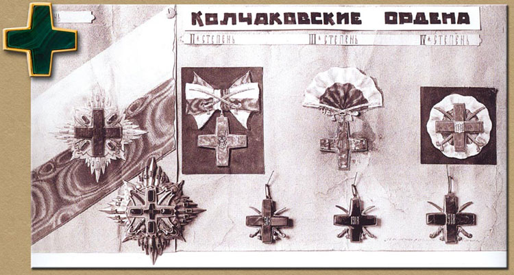 Комплект всех степеней ордена «Освобождение Сибири» - единственная фотография проектных эскизов и пробных экземпляров ордена, изготовленных Екатеринбургской художественно-технической школой, экспонировавшиеся в Новосибирском музее в 1930-х гг.