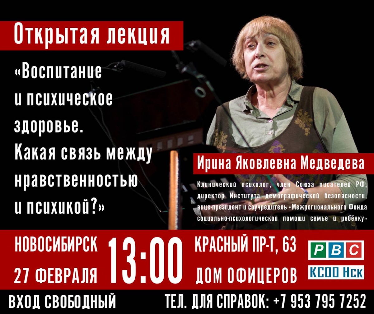 Лектор: Ирина Яковлевна Медведева. Клинический психолог, член союза писателей РФ, директор Института демографической безопасности, вице-президент и соучредитель «Межрегионального Фонда социально-психологической помощи семье и ребёнку».