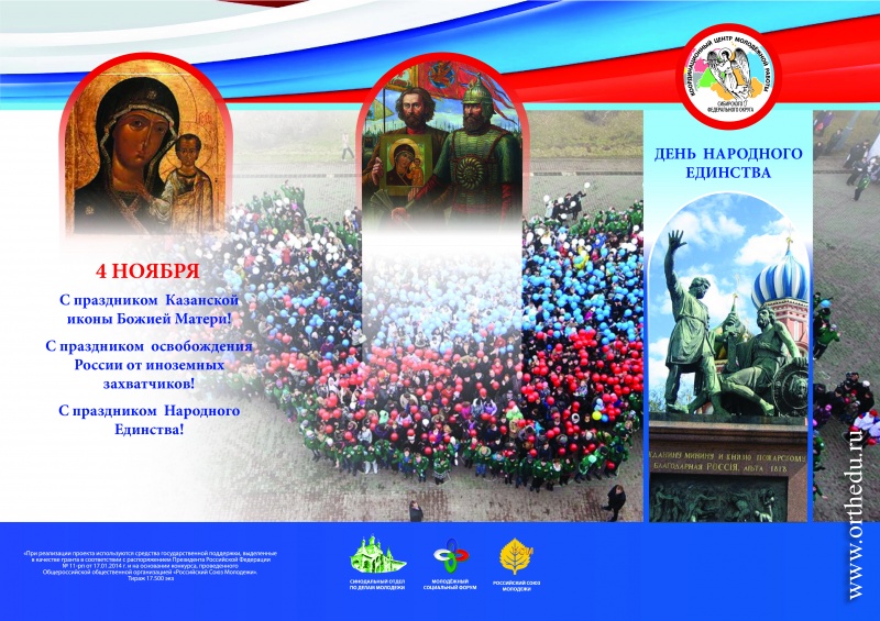 Акция "День народного единства и Казанской иконы Божией Матери"Информационные буклеты посвящённые ежегодному празднику празднику Казанской иконы Божией Матери и Дню народного единства (4 ноября). Акция проводиться в рамках «Общецерковного плана молодёжной работы — 2014» Синодального отдела по делам молодёжи Московского Патриархата. По завершении акции, большая просьба выложить несколько фотографий в «Новостную ленту» всесибирского молодёжного информационного поля: http://vk.com/polenews. Так же лучшие фотографии будут опубликованы на "Образовании и Православии".