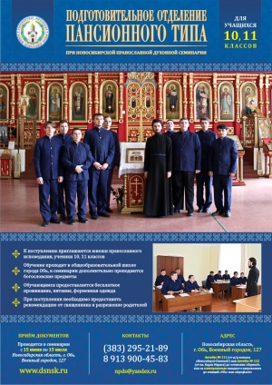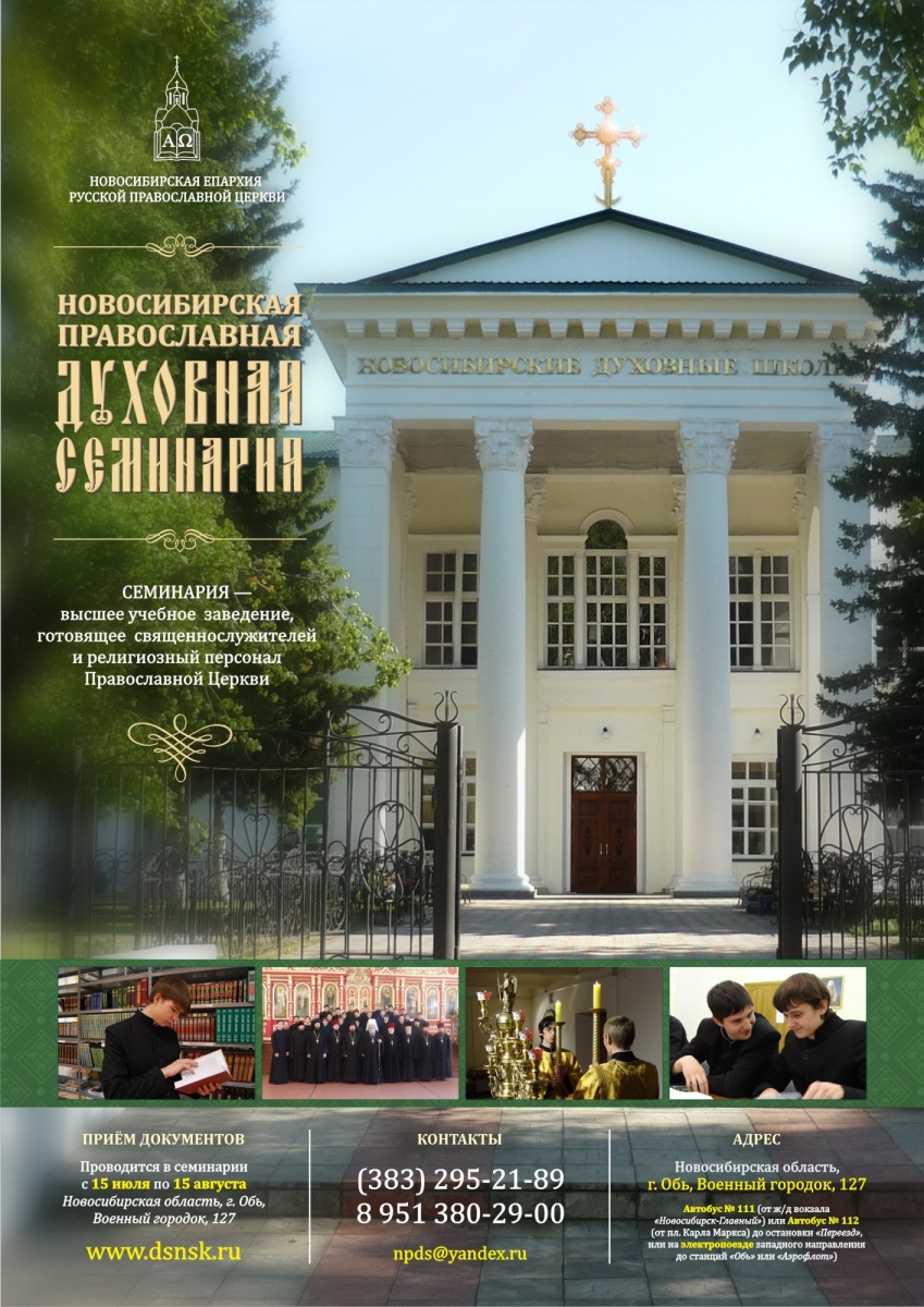 День открытых дверей в Новосибирской Духовной СеминарииВ Новосибирской Православной Духовной Семинарии 28 апреля в 15-00 состоится День открытых дверей. В программе будет представлен рассказ об истории семинарии, учебном процессе и жизни студентов. Приглашаем всех интересующихся духовным образованием. Адрес: г. Обь, Военный городок, 127 Проезд на автобусе № 111 (от ж/д вокзала «Новосибирск-Главный») или № 112 (от пл. Карла Маркса) до остановки «Переезд» или на электропоезде западного направления до станций «Обь» или «Аэрофлот» Тел.: (383) 295-21-89, e-mail: npds@yandex.ru
