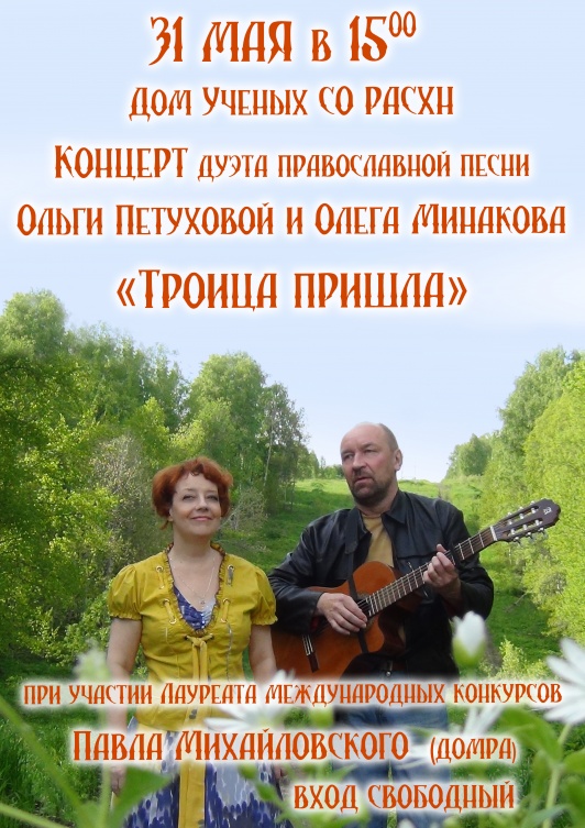 Концерт "Троица пришла"31 мая в 15.00 в Доме Ученых СО РАН состоится концерт дуэта православной песни Ольги Петуховой и Олега Минакова "Троица пришла". При участии лауреата международных конкурсов Павла Михайловского (домра).