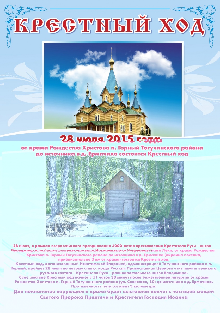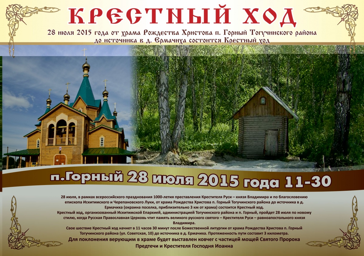 28 июля 2015 года от храма Рождества Христова п. Горный Тогучинского района до источника в д. Ермачиха состоится Крестный ход28 июля, в рамках всероссийского празднования 1000-летия преставления Крестителя Руси – князя Владимира и по благословению епископа Искитимского и Черепановского Луки,от храма Рождества Христова п. Горный Тогучинского района до источника в д. Ермачиха (окраина поселка, приблизительно 3 км от храма) состоится Крестный ход. Крестный ход, организованный Искитимской Епархией, администрацией Тогучинского района и п. Горный, пройдет 28 июля по новому стилю, когда Русская Православная Церковь чтит память великого русского святого – Крестителя Руси – равноапостольного князя Владимира. Свое шествие Крестный ход начнет в 11 часов 30 минут после Божественной литургии от храма от храма Рождества Христова п. Горный Тогучинского района (ул. Советская, 10) до источника в д. Ермачиха (окраина поселка, приблизительно 3 км от храма). Протяженность пути составит 3 километра. Для поклонения верующим в храме будет выставлен ковчег с частицей мощей Святого Пророка Предтечи и Крестителя Господня Иоанна. Начало Крестного хода 28 июля 2015 года в 11 часов 30 минут.