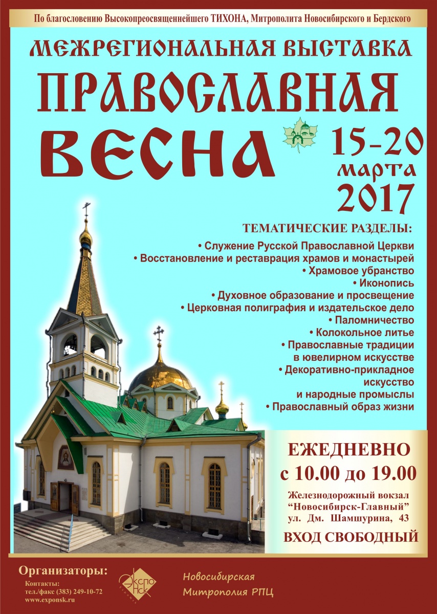 Расписание работы выставки «Православная весна»100-летие восстановления Патриаршества в Русской Православной Церкви 135-летие Императорского Православного Палестинского Общества 80-летие Новосибирской области 130-летие со дня освящения Александро-Невского храма, р.п. Колывань, НСО 150-летие со дня основания Собора во имя Святой Живоначальной Троицы, р.п. Колывань, НСО 15 марта, среда 10.00 - Начало работы выставки 11.30 - Встреча иконы 12.00 - Молебен. Официальная церемония открытия (сцена, зимний сад) Проповедь у иконы Божией Матери "Державная" (к 100-летию явления в Коломенском) Концерт. Брифинг. Экскурсия почётных гостей по выставке. 15.00 - к 135-летию ИППО Встреча с доктором богословия, действительным членом Императорского Православного Палестинского общества, протоиереем Борисом Пивоваровым (конференц-зал, 3 этаж) 17.00 - "Кавказские старцы. Паломничество в горы Абхазии" - встречу ведёт член союза писателей России, член редколлегии журнала "Русский Дом", член попечительского совета Военно-православной миссии, кавалер ордена святого Царя Николая II - писатель Юрий Воробьевский, г. Москва (конференц-зал, 3 этаж) 19.00 - Окончание работы выставки 16 марта, четверг 10.00 - Начало работы выставки 11.00 - Молебен (У Святыни) 11.00 - "Итоги столетия. Революция и церковь. Историко-церковное краеведение" - круглый стол. Ведёт руководитель информационно-издательского отдела Искитимской епархии Новосибирской митрополии протоиерей Игорь Затолокин, участвуют: директор Бийского музея Алтайской духовной миссии П.С.Коваленко, доцент НГАХА И.Л. Ростовцева, к.и.н., доцент кафедры отечественной истории ГФ НГУ Вадим Журавлёв, к.ф.н., проректор по научной работе Новосибирской православной духовной семинарии протодиакон Димитрий Цыплаков, преподаватель школы звонарей при Новосибирском Свято-Макарьевском православном богословском институте Алексей Талашкин. (Конференц-зал, 3. этаж) 15.00 - Демонстрация православных фильмов 17.00 - "К 100-летию февральской революции" - творческая встреча с писателем Ю. Воробьевским (конференц-зал, 3 этаж) 19.00 - Окончание работы выставки 17 марта, пятница 10.00 - Начало работы выставки 11.00 - Молебен 12.00 - Круглый стол: "130-летие со дня освящения Александро-Невского храма, р.п. Колывань" (конференц - зал, 3 этаж) 13.00 - "Общество русской словесности - миссия, традиции и современность" круглый стол - проводит О.В. Капустина председатель Общества русской словесности, новосибирское отделение (конференц-зал, 3 этаж) 15.00 - Демонстрация православных фильмов: "Рождество Богородицы" - фильм митрополита ИЛЛАРИОНА (Алфеева), (конференц-зал, 3 этаж) 17.00 - Творческая встреча с писателем Ю. Воробьевским: "Ещё раз о феномене неоязычества" (конференц-зал, 3 этаж) 19.00 - Окончание работы выставки 18 марта, суббота 10.00 - Начало работы выставки 11.00 - Молебен 12.00 - Демонстрация православных фильмов 13.00 - "О Жизни…О Любви…О Вечности…" - Авторскую встречу проводит новосибирская поэтесса, член Российского союза писателей Ангелена Сапрыкина (конференц-зал, 3 этаж) 15.00 - Хоровой концерт-лекция. Участвует архирейский хор Кафедрального Вознесенскоко собора. Ведёт программу матушка Татьяна Реморова, (сцена, зимний сад) 17.00 - Творческая встреча с писателем Ю. Воробьевским. (конференц-зал, 3 этаж) 19.00 - Окончание работы выставки 19 марта, воскресенье 10.00 - Начало работы выставки 11.00 - Молебен 12.00 - "Современная семья под прицел