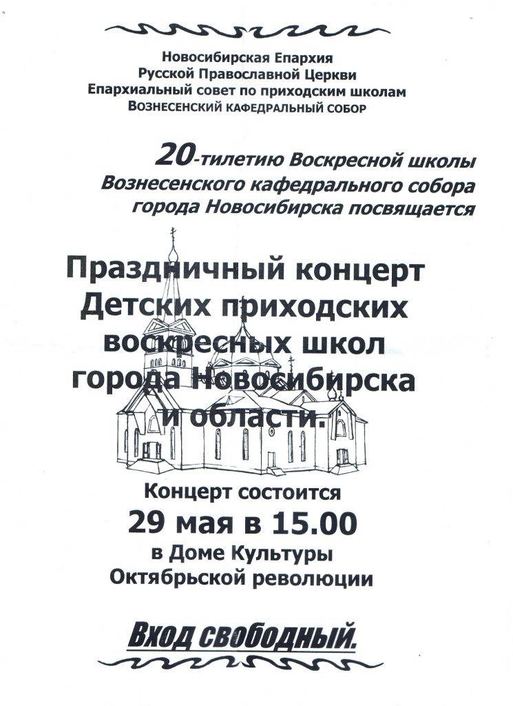 Праздничный концерт Детских приходских воскресных школ г. Новосибирска и областиПосвященный 20-тилетию Воскресной школы Вознесенского кафедрального собора города Новосибирска. Концерт состоится 29 мая в 15:00 в Доме Октябрьской революции. Вход свободный