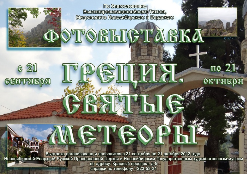 21 сентября состоится открытие Фотовыставки «Греция. Святые Метеоры»ОТКРЫТИЕ ФОТОВЫСТАВКИ «ГРЕЦИЯ. СВЯТЫЕ МЕТЕОРЫ» В праздничный день – Рождество Пресвятой Владычицы нашей Богородицы и Приснодевы Марии -, 21 сентября 2012 года, в 14.00., Высокопреосвященнейший Тихон, Митрополит Новосибирский и Бердский, примет участие в церемонии торжественного открытия Фотовыставки «Греция. Святые Метеоры», которая состоится в Новосибирском Государственном художественном музее (Красный проспект, дом 5). По приглашению Владыки Тихона, в церемонии торжественного открытия Фотовыставки примут участие члены Правительства Новосибирской области, представители руководства мэрии города Новосибирска, а также участники паломнической поездки по святым местам Греции. Авторами фоторабот, представляемых на выставке «Греция. Святые Метеоры», являются сами участники поездки: Владыка Тихон, протоиерей Василий Бирюков, протоиерей Иаков Конкин, Минин И.С., Богдан О.В.. Выставка «Греция. Святые Метеоры», организованная по благословению Митрополита Тихона и проводимая Новосибирской Епархией Русской Православной Церкви совместно с Новосибирским Государственным художественным музеем, в представленных на ней фотоработах участников паломнической поездки, расскажет об удивительных местах, где небесная благодать непостижимо сочетается с красотой творения, а богатство земных даров с высотой подвижнического духа. Такова Святая Метеора – горная монашеская страна, второй после Святой Горы Афонской центр православного монашества в Греции. «Метеора» по-гречески означает «парящий в воздухе». Так называется комплекс монастырей и скитов, которые расположены на вершинах гор в небесах. Фотовыставка будет работать в Новосибирском Государственном художественном музее с 21 сентября по 21 октября 2012 года. Справки о работе выставки можно получить по телефону – 223-53-31.