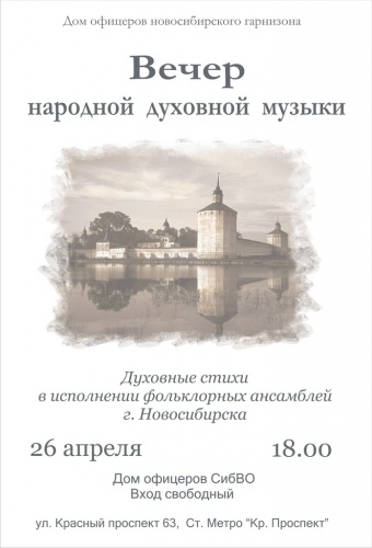 26 апреля вечер Народной духовной музыки26 апреля в Доме офицеров Новосибирского гарнизона прозвучат духовные стихи в исполнении фольклорных ансамблей г. Новосибирска. Вечер
