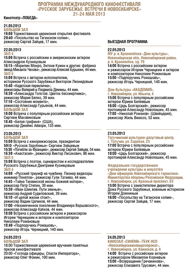 С 21 по 24 мая - Международный кинофестиваль "Русское зарубежье. Встречи в Новосибирске"С 21 по 24 мая по благословению Преосвященнейшего Тихона, митрополита Новосибирского и Бердского, в Новосибирске пройдёт международный кинофестиваль "Русское зарубежье. Новосибирске встречи". Вход на все мероприятия и показы фестиваля свободный. Кинофестиваль «Русское Зарубежье» — это первый в истории отечественного фестивального движения форум, посвященный триумфу и трагедии российского изгнания и жизни русских зарубежных диаспор. Цель фестиваля — способствовать объединению русских общин всего мира. Главными учредителями и организаторами фестиваля являются: Дом Русского Зарубежья имени Александра Солженицына и киностудия "Русский путь". В жюри конкурсов игровой и документальной программ в разные годы входили выдающиеся мастера отечественной и зарубежной культуры, такие как кинорежиссеры Глеб Панфилов, Геннадий Полока, Александр Долгорукий (Франция), исследователи российского и зарубежного кинематографа Рашит Янгиров, Сергей Лаврентьев, Марина Тарковская, известный славист из США Джон Глэд и другие. Гостями и лауреатами фестиваля стали Никита Михалков, Андрис Лиепа, Владимир Грамматиков, Джоанна Мерлин, Николай Караченцов, Юрий Назаров, Аида Ведищева, Святослав Бэлза, Сергей Юрский, Бен Хеллман, Владимир Фокин, Анатолий Смелянский, Марина Влади, Тонино Гуэрра, Зураб Чавчавадзе. Дополнительные показы фильмов конкурсной программы фестиваля «Русское Зарубежье» с успехом прошли в Хельсинки, Вашингтоне, Сан-Франциско, Софии, Белграде и Париже. Каталог международного кинофестиваля "Русское зарубежье. Новосибирские встречи".