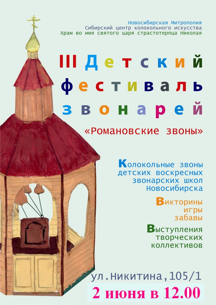 2 июня начинается III Детский фестиваль звонарей «Романовские звоны…»По благословению Его Высокопреосвященства, Высокопреосвященнейшего Тихона, Митрополита Новосибирского и Бердского 2 июня 2013 года в 12.00 в Приходе во имя святого царя страстотерпца Николая II (г. Новосибирск) начнется III Детский фестиваль звонарей «Романовские звоны…». Фестиваль посвящается к 400-летию Дома Романовых, 145-летию со дня рождения святого царя страстотерпца Николая II, 95-летию мученической кончины Царской Семьи. Целью проведения ежегодного детского фестиваля является привлечение интереса детей к обучению колокольному звону как неотъемлемому элементу богослужения, имеющего огромный миссионерский потенциал. В рамках детского фестиваля, кроме выступления звонарей, предусмотрены викторины, конкурсы, подвижные игры, выступления творческих коллективов. Будем рады видеть всех на нашем фестивале. Место проведения: Приход во имя святого царя страстотерпца Николая II, г. Новосибирск (www.tsar-nikolay.ru), ул. Никитина, 105/1. Проезд до остановки "Академия управления и экономики" трамваем №13, автобусами №1159, 1197, маршрутными такси № 14, 44, 44а, 1130.