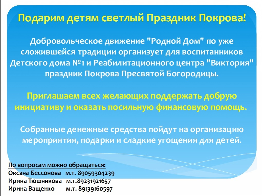 До 19 октября - Приглашаем всех подарить детям светлый Праздник Покрова Пресвятой Богородицы!Добровольческое движение "Родной Дом" по уже сложившейся традиции организует для воспитанников Детского дома №1 и Реабилитационного центра "Виктория" праздник Покрова Пресвятой Богородицы. Приглашаем всех желающих поддержать добрую инициативу и оказать посильную финансовую помощь. Акция пройдет до 19 октября.