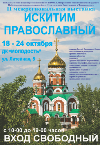 18-24 октября пройдет II межрегиональная выставка «Искитим православный»Выставка пройдет с 18 по 24 октября с 10-00 до 19-00 часов по адресу: Искитим, ДК "МОЛОДОСТЬ" ул. Литейная, 5. Вход свободный. Расписание работы выставки «ИСКИТИМ ПРАВОСЛАВНЫЙ»