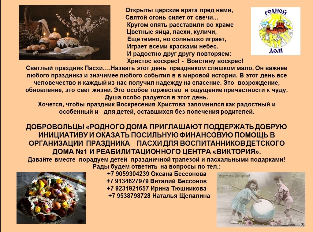 Помощь в организации праздника Воскресения Христова для детей, оставшихся без попечения родителейОткрыты царские врата пред нами, Святой огонь сияет от свечи... Кругом опять расставили во храме Цветные яйца, пасхи, куличи, Еще темно, но солнышко играет, Играет всеми красками небес. И радостно друг другу повторяем: Христос воскрес! - Воистину воскрес!