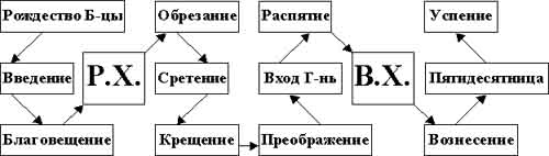 Будем всеми силами стараться В середине минувшего тысячелетия возникло понятие симметрии. Впервые -- в теории живописи. Позже -- в архитектуре, математике, физике, химии и биологии. Распространение принципов симметрии на большой спектр научных дисциплин, привело к существенному расширению и обогащению этого понятия, вплоть до приобретения им статуса философской категории. Если сначала симметрия объектов рассматривается как точное совпадение их элементов при определенных пространственных трансляциях (кристаллография), то к концу прошлого века ученые говорят уже о симметрии во времени (музыковедение), слабой симметрии (физика), симметрии подобия (биология). В восьмидесятые годы представлением о симметрии начали пользоваться богословы для анализа структуры библейских текстов [1]. В частности, было обнаружено, что повествование первой главы Библии о сотворении мира образует "два симметричных, или, как принято говорить, параллельных ряда" [2]. Настоящая работа содержит попытку определения некоторых структурных закономерностей, характерных не только для Священного Писания, но и для Священного Предания. Главные события новозаветной Священной истории -- Рождество Христово (на нашей схеме -- Р.Х.) и Воскресение Христово (В.Х.). На их симметрию указывают тексты пасхальных песнопений. Например, икос пасхального канона: "Идем, потщимся якоже волсви и поклонимся, и принесем миро яко дары, не в пеленах, но в плащанице обвитому…" И с Рождеством, и с Воскресением связаны по шесть других эпизодов Священной истории, в основном отмечаемых Церковью как двунадесятые праздники. Они попарно симметричны: Рождество Богородицы и Обрезание Господне, Введение во храм Девы Марии и встреча в этом храме Богомладенца (Сретение), Благовещение и Богоявление. Крестной смерти Христа противостоит Успение Пресвятой Богородицы. Торжественному Входу Господа в Иерусалим симметричен вход в этот город Святого Духа (Пятидесятница). Преображению соответствует Вознесение на небо преображенной Христом человеческой плоти.