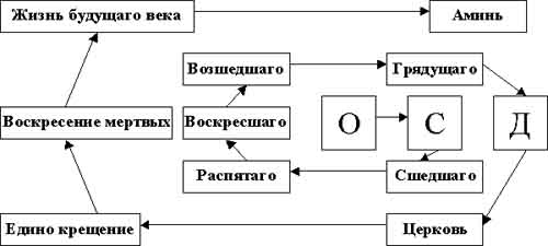 Члены Никео-Царьградского Символа веры расположим не так, как обычно, -- линейно, а по спирали. В этом случае тексты, раскрывающие тринитарный догмат, оказываются рядом и на одном уровне. Такая запись Символа, особенно в своей христологической части, также обладает семичастной симметрией.