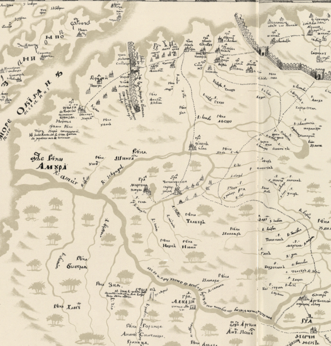 Интересные название этих оГОРОДОВ: Уванзин – столина Кореян, у казаков сведений до границы с Китаем о городах не было, поэтому все они просто Городки, далее Стена, но не Великая китайская, а граница коренья с китайцы (там где караул с китайцы), далее сведения непосредственно от китайцев с городами Фонкучин, Лянцажан, Янту, Лянцыжан, Танчюсан, Лоян, Синсяжан, Ксицин, Насян, Консын, Сухощан, Великий Синячинфу. По границе Никанского царства с Нерчинским казачьим воеводством заставы-города града Чичигарской и Мерген. Ну и за Китайской Великой Стеной в царстве Китайском: Соляные городки, Варницы городки, Шахакван, Янпинфу, Шакасин, Сифинку, Сунхуа, Шахон, Дунжинсян, Цыджу, Тенжин и столица – град Пекин.