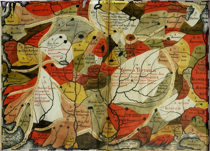 Но прежде чем перейти к истории составления этого атласа, необходимо остановиться на другой попытке - попытке старой Московской Руси в ту же петровскую эпоху со своей стороны дать генеральный чертеж - правда, не всей России, но наименее известной ее части - Сибири. Попытку эту сделал боярский сын С. У. Ремезов в далеком Тобольске. Карты Сибири 1695 и 1697 гг. и большая чертежная книга Сибири составлены Ремезовым в 1701 г. Ее составление уходит своими корнями далеко в глубь веков - для Сибири, должно быть, еще к временам Великого Новгорода.