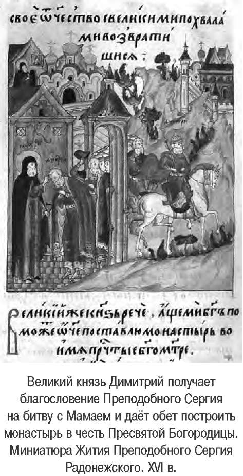По словам современника, Преподобный Сергий «тихими и кроткими словами» мог действовать на самые загрубелые и ожесточённые сердца. Очень часто он примирял враждующих между собою князей, уговаривая их подчиняться великому князю Московскому, благодаря чему ко времени Куликовской битвы почти все русские князья признали главенство Димитрия Московского. На Куликовом поле должна была пройти проверку на прочность стратегическая линия Москвы на собирание вокруг себя русских земель. Эта битва должна была показать, может ли ещё только формирующееся Русское государство быть самостоятельным действующим лицом на исторической арене и, по сути дела, единственной опорой православия в условиях всё усиливавшегося противостояния католичества и ислама.Таким образом, в Куликовской битве правда власти была очевидной: все её ресурсы были мобилизованы не для защиты самой власти в лице, как бы мы сейчас сказали, правящей элиты, а для защиты самих основ существования русского народа. Тем не менее, несмотря на правоту дела, великий князь Димитрий Иванович не принимал окончательного решения до тех пор, пока не получил удостоверения в том, что задуманный им шаг угоден Богу. Отправляясь на эту битву, Димитрий в сопровождении князей, бояр и воевод поехал именно к Преподобному Сергию Радонежскому, чтобы помолиться вместе с ним и получить от него благословение. Благословение было дано. В бой Преподобный посылает и своих монахов — Александра Пересвета и Андрея Ослябю. Это были искусные воины-богатыри. Иноки-воины вдохновили дружины Димитрия и стали героями Куликовской битвы. Приблизившись к Дону, Димитрий Иванович колебался, переходить ему реку или нет. И только по получении от Преподобного Сергия ободрительной грамоты, увещевавшей его как можно скорее напасть на татар, приступил к решительным действиям. Куликовская битва стала импульсом «второго рождения» Руси: для битвы на Куликовом поле собрались дружины тверичей, ярославичей, костромичей — дружины разных князей, а после победы покинули его единым войском объединённых русичей.Наш замечательный историк Василий Осипович Ключевский называет Преподобного Сергия «благодатным воспитателем русского народного духа. Ведь он своей жизнью дал увидеть русскому народу, что в нём ещё не всё доброе погасло и замерло. Он открыл им глаза и помог заглянуть в свой собственный внутренний мир». «Народ, привыкший сто лет дрожать при одном имени татарина, — говорил историк, — собрался наконец с духом, встал на поработителей и не только нашёл в себе мужество встать, но и пошёл искать татарские полчища в открытой степи и там повалился на врагов несокрушимой стеной, похоронив их под своими многотысячными костями. Как могло это случиться? Откуда взялись, как воспитались люди, отважившиеся на такое дело, о котором боялись и подумать их деды? Мы знаем одно, что Преподобный Сергий благословил на этот подвиг главного вождя русского ополчения, и этот молодой вождь был человек поколения, возмужавшего на глазах Преподобного Сергия». Авторитет святого старца неуклонно возрастал в русском народе. Димитрий Донской и другие князья постоянно приезжали за советом к нему, просили помолиться или стать крёстным отцом своих сыновей. Святой молился об объединении Руси и много делал для примирения враждующих князей.В мае 1389 года