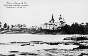 Крестный монастырь был основан в 1656 году патриархом Никоном на острове Кий, в нескольких километрах от устья реки Онеги. Впервые на этот остров Никон попал в 1639 году, когда поссорившись с братией Анзерской пустыни, бежал на материк на небольшой лодке. В пути его настигла буря, которое выбросила утлое суденышко на необитаемый островок Кий. Островок имеет 2 километра в длину и 1 в ширину. На месте своего спасения Никон возрузил деревянный крест и по преданию обещал в будущем основать здесь обитель.