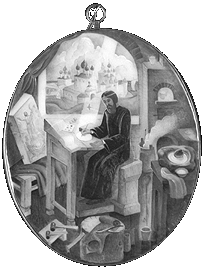 Богоматерь из деисусного чина. 1408г. Прп. Андрей Рублев, Даниил Черный и мастерская.ГТГПасха в 191... году была ранняя... В старинном городе Р., на берегу большого озера, особенно грязно этой порой. Талая вода большими лужами подолгу стоит даже на центральных площадях и улицах города, не успевая стекать в озеро по незначительному уклону берега. Нужно много осторожности и искусства, чтобы не выпачкаться в грязи, идя в праздничной одежде ко службе или от службы, в гости или из гостей. В такую-то пору, в первый день Пасхи, разговевшись дома с семьей и выспавшись, как полагается после ночной службы, пошел по своим родным и друзьям поздравить с праздником и похристосоваться – Иван Ал., житель одной из окраинных улиц города. Тихо и мирно, в труде неустанном, текла жизнь этого раба Божия. В семье его – жена, дочь-девушка, другая дочь замужняя, сын которой – ему внучек – жил у дедушки, учась в ближайшей школе. Занятием его было рисование иконок по финифти – ремесло, очень распространенное в этом городе. Вся семья обыкновенно принимает участие в этом промысле, исполняя который-нибудь из одиннадцати приемов подготовки финифти и рисования по ней: один готовит основу для финифти, другой покрывает ее глянцем, третий закаливает или обжигает в печи, иной покрывает фон, еще иной набрасывает контуры изображения, иной разрисовывает, пишет одежду, еще иной наводит лик, затем производится начистую окончательная отделка, изображаемая наиболее опытным мастером, и, наконец, – финифтяная иконка окаймляется серебряною или металлическою рамочкой, подклеивается бархатом, и иконка готова – вполне приличная, очень прочная и дешевая. Тысячами шли заказы этих иконок со всех святых мест Русской земли, тысячи людей кормились этим ремеслом, тысячи уголков украшались этими иконками по городам и весям нашим. Много таких иконок написал и Иван Ал. со своей семьей, принимая заказы от более крупных мастеров и поставщиков. В последнее время особенно много написал он иконок Черниговской Божией Матери для Гефсиманского скита (близ Троице-Сергиевой Лавры), где тогда эта икона особенно славилась своими чудесами, привлекая тысячи богомольцев. Дивный лик Царицы Небесной, со всеми мельчайшими деталями Ее одежды, так глубоко врезался в душе Ивана Ал. от многократного писания, что он только и видел этот лик, неизгладимый никакими другими впечатлениями.