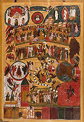 С видением пророка Даниила может быть связан ещё один, более редкий вариант иконографии “Страшного Суда”, известный лишь по двум иконам второй половины XVI века – из Стокгольмского музея и из Воскресенского собора города Тутаева 48. В состав композиции здесь входит особый регистр, представляющий шествие праведного воинства из погибельного града в град Небесный. Тема противопоставления двух градов восходила, в конечном счёте, к “погибельным царствам” и “вечному царству праведных” из видения Даниила (таким же образом можно интерпретировать этот мотив в иконе “Благословенно воинство Небесного Царя”, послужившей прототипом для этой иконографии) 49.