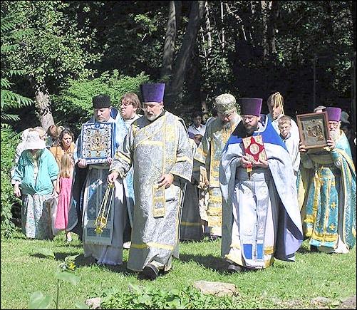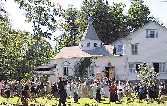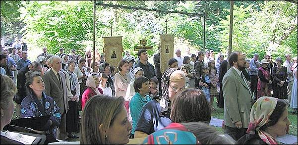Стоял замечательный теплый осенний день, что позволило совершить богослужение по старому обычаю, в часовне на дворе. Прихожане и молящиеся, прибывшие из других приходов, были утешены присутствием на торжестве главной святыни Русской Зарубежной Церкви – чудотворной Коренно-Курской иконы Божией Матери, в честь которой и названа пустынь в Магопаке. Торжественно и умилительно пел епархиальный женский хор имени святых Жен-Мироносиц под управлением Евгении Темидис. Владыка в своем слове сравнил пение хора с пением монахинь на Святой Земле. Богослужение завершилось крестным ходом с молебным пением (фото ниже).
