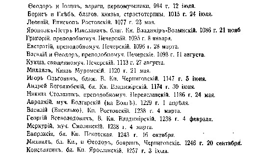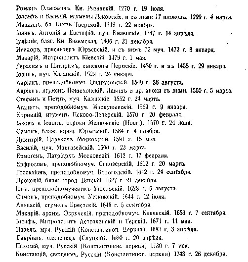 Устанавливая предмет и пределы того, что может войти в собрание материалов о мучениках, мы имеем повод и основание дать полный список мучеников российских прежних времен. Отсюда мы получим назидательное сравнение между мучениками прежними и новыми и список последних может быть оправдан.