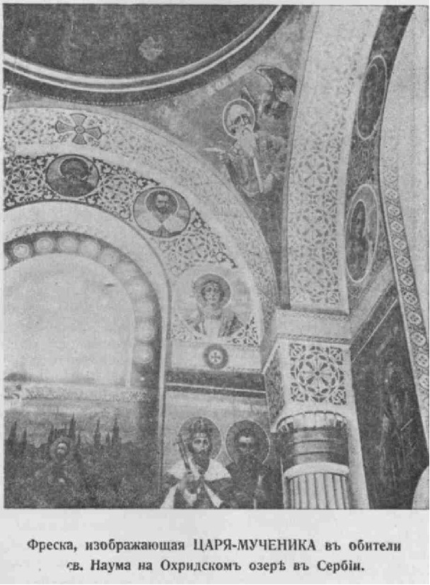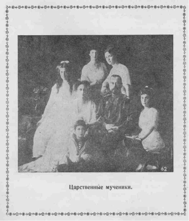 {8} A разве не стал в одном лик святых страстотерпцев, благоверных князей Бориса и Глеба, убиенных Святополком Окаянным только для закрепления своей власти, Государь Николай Второй? А зарезанный в Угличе царевич Димитрий не имеет ли с собой такого же нежного, окровавленного отрока цесаревича Алексия и также ни в чем неповинных четырех прекрасных дев, сестер его? А их мать, соименная святой мученице царице Александре, и также сестра ее, великая княгиня Елизавета Феодоровна, не стали ли первомученицами нашего времени после княгинь Евпраксии и Иулиании?