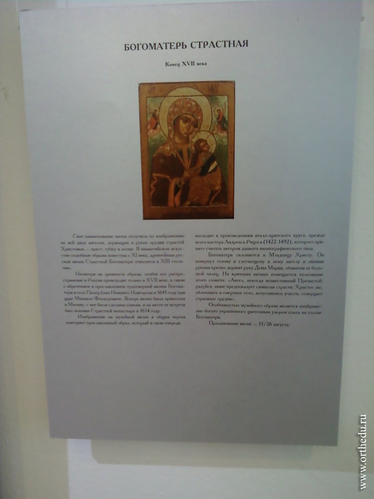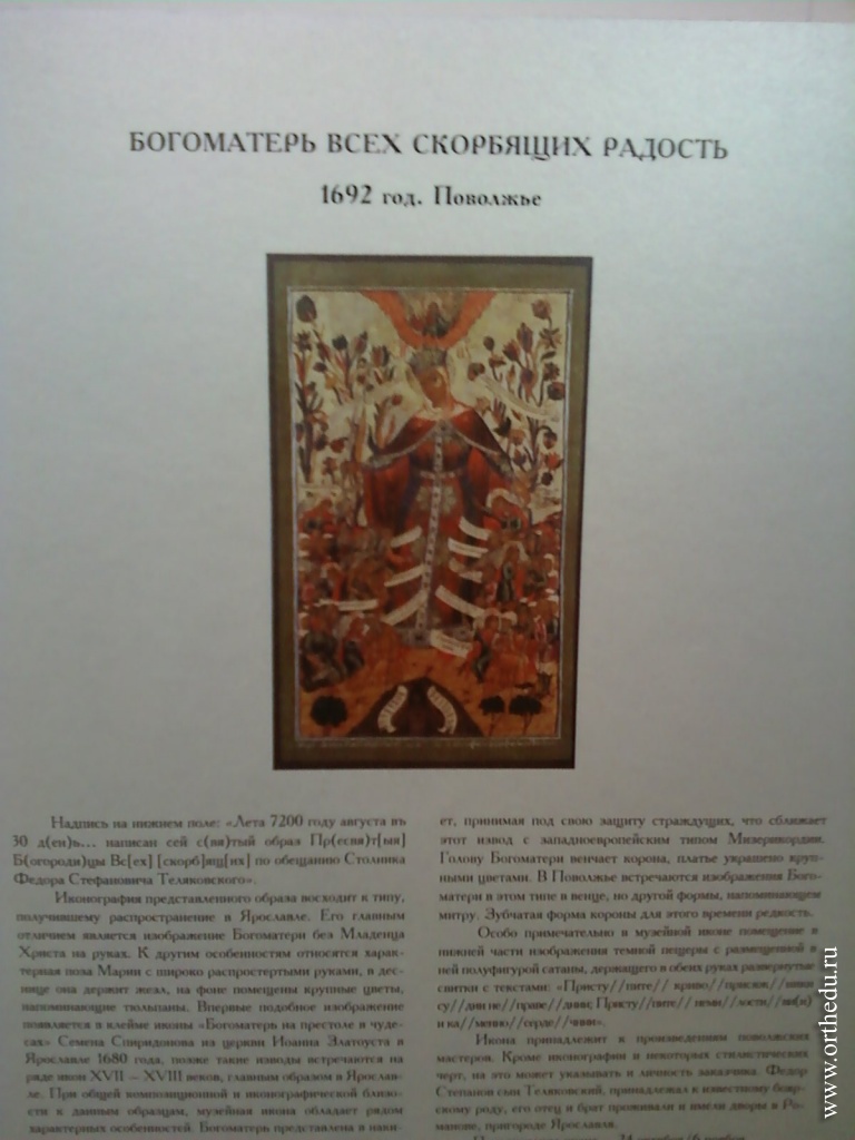Христианская Русь особо почитала Божью Матерь как свою Заступницу и Покровительницу. С иконами Владимирской, Знамением, Казанской были связаны исключительные страницы нашей отечественной истории. Но Царица Небесная не только заступница Святой Руси – Она участвует в жизни каждой верующей души. Об этом свидетельствует название икон позднего периода: «Всех скорбящих радость», «Неувядаемый цвет», «Утоли моя печали».