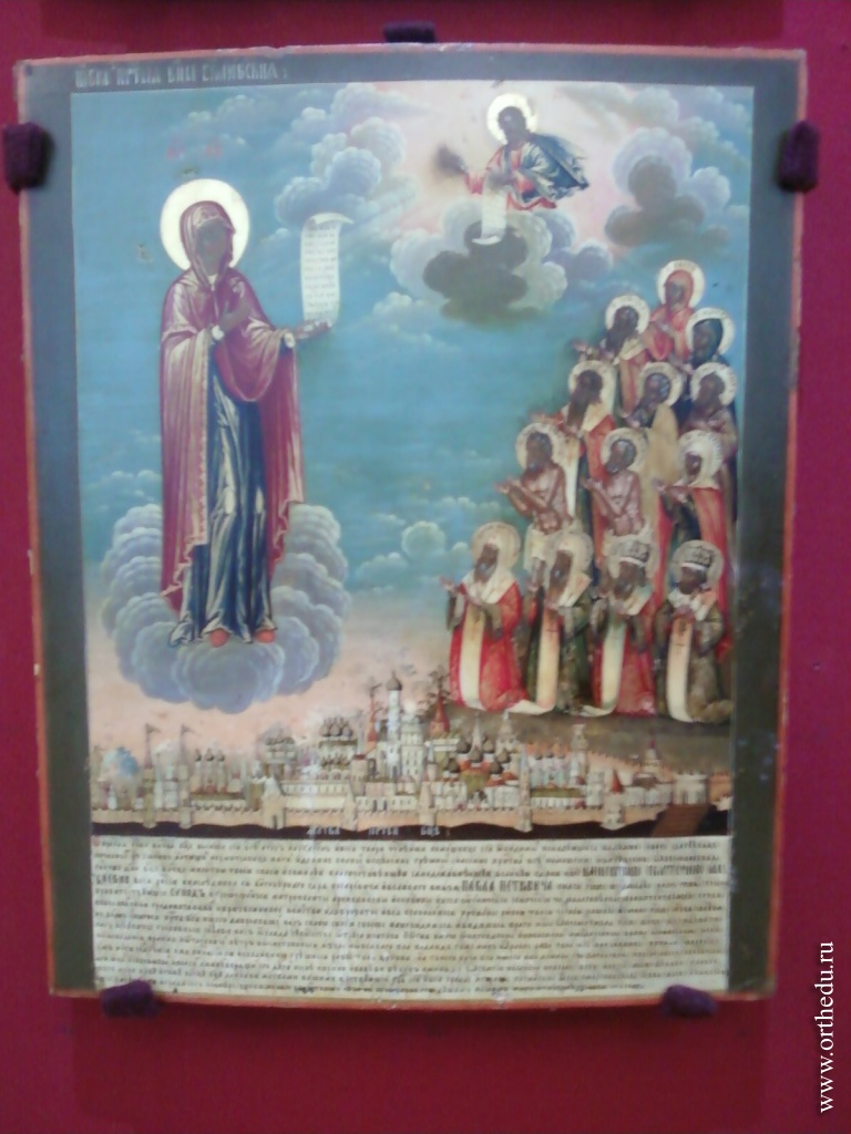 Боголюбская икона Пресвятой Богородицы (XVI) интересна особым «московским» акцентом: здесь мастер изобразил молящихся перед Богородицей московских святых (в их числе святителя Алексия, Василия Блаженного) и представил панорамное изображение Москвы.