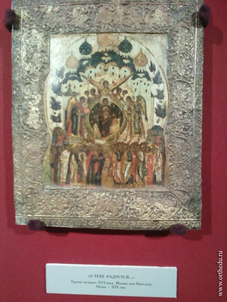 Названию выставки дал один из самых древних памятников, образ Пресвятой Богородицы «О Тебе радуется» — это первые строки молитвы преподобного Иоанна Дамаскина.