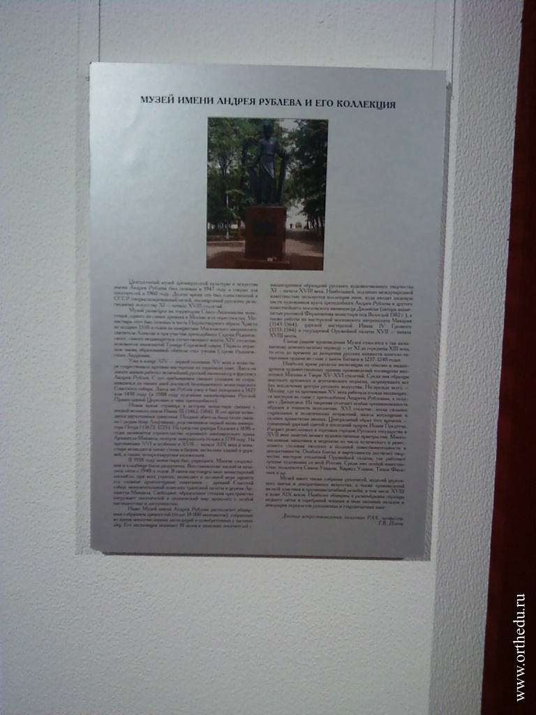 — Наш музей находится в Москве, на территории бывшего Спасо-Андроникова монастыря. Он носит имя Андрея Рублева, поскольку этот иконописец жил, творил и, скорее всего, закончил свою земную жизнь на территории этого монастыря, где и был похоронен.