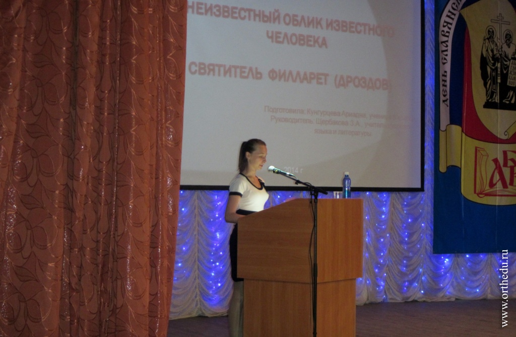 Книга – источник открытий15 мая 2014 года в Искитимском районном Доме культуры имени Ленинского комсомола, в рамках ежегодных Кирилло-Мефодиевских чтений, прошла конференция «Книга – источник открытий». 15 мая 2014 года в Искитимском районном Доме культуры имени Ленинского комсомола, в рамках Кирилло-Мефодиевских чтений, прошла конференция «Книга – источник открытий», организованная Управлением образования администрации города Искитима при поддержке и участии Искитимской епархии, а также Новосибирской областной общественной организации «Союз православных женщин». Перед началом конференции с приветственным словом выступил секретарь епархиального управления Искитимской епархии – иеромонах Иоанн (Кутырев). Отец Иоанн отметил, что именно благодаря письменности святые учители и просветители Кирилл и Мефодий объединили народы. Собравшимся были предложены доклады. Первый из них зачитала ученица школы №3 Ирина Павленок. Ее яркий и эмоциональный доклад был посвящен описанию духовных праздников и обычаев в романе И.С. Шмелева «Лето Господне». Второй доклад «Неизвестный облик известного человека. Святитель Филарет (Дроздов)» зачитала ученица школы №5 Ариадна Кунгурцева. В своей работе она обозначила многие неизвестные широкому кругу факты биографии архипастыря, состоявшего в открытой поэтической переписке с Пушкиным. Еще один доклад ученицы школы №3 Анастасии Курмаевой был посвящен Владимиру Мономаху. Но уже своим названием доклад предлагал взглянуть на эту легендарную личность с несколько иной стороны: «Владимир Мономах – талантливый писатель своего времени». Затем своими впечатлениями о поездке в город Белгород поделилась заведующая МБДОУ «Медвежонок» Л.И. Макаренко. Она же зачитала доклад «Книга учит и книга воспитывает только тех, кто читает и впитывает». Наряду с представленными докладами собравшиеся могли ознакомиться со стендовыми работами: «Сергий Радонежский как государственный деятель» Александры Катаевой; «Причины гибели семьи императора Николая II» Елизаветы Снегиревой, а также с исследованием «Устное творчество в жизни младших школьников» Ольги Машкиной, учительницы начальных классов. По окончании всех докладов состоялось награждение участников.