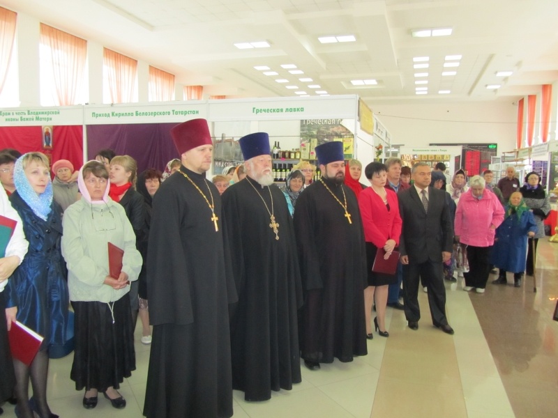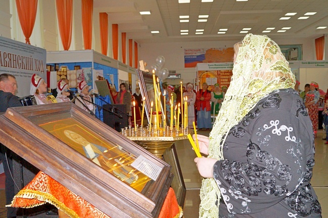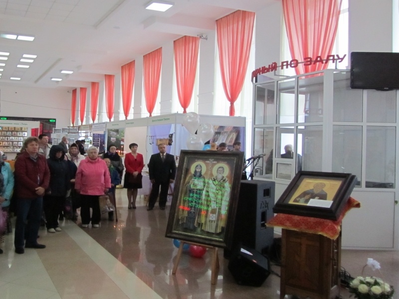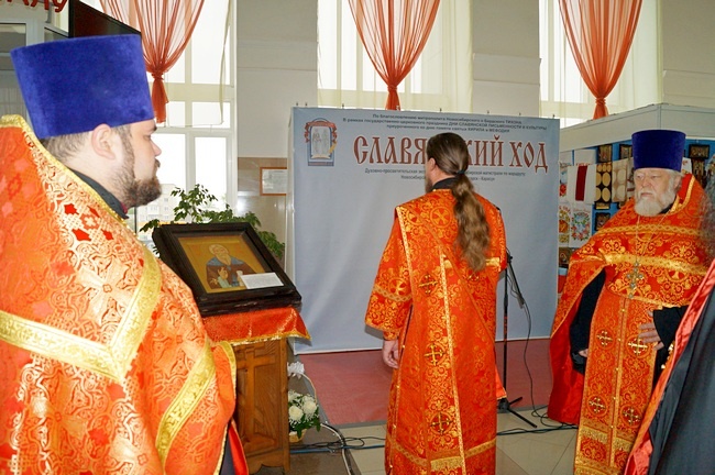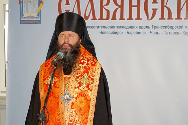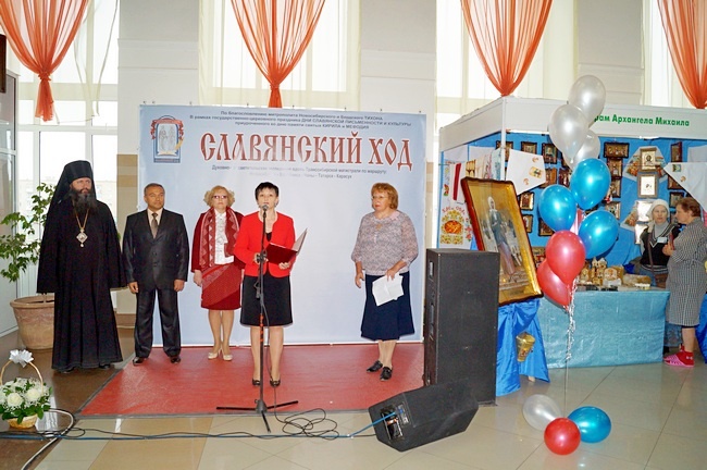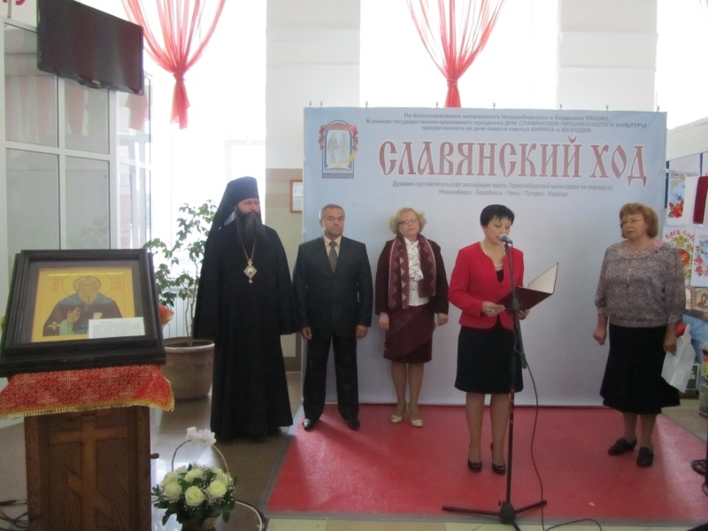 Славянский ход. Cтанция Барабинск.С 11 по 31 мая 2014 года, в рамках празднования государственно-ц Духовно-просвети Славянский ход проходит вдоль важнейшей транспортной артерии России — Транссибирской магистрали — по маршруту Новосибирск – Барабинск – Чаны – Татарск – Карасук. 17 мая в 11 часов епископ Каинский и Барабинский Феодосий и глава города Барабинска Кибальников Александр Васильевич встретили экспедицию на барабинской земле, открыли православную выставку в помещении железнодорожного вокзала станции Барабинск. Началом открытия выставки стала встреча иконы преподобного Сергия Радонежского с частицей мощей, которая заняла на выставке центральное место. Жители и гости имели возможность познакомиться с разделами выставки, отражающими служение русской православной церкви, восстановление храмов и монастырей, храмовое убранство, иконопись, духовное образование и просвещение, православные традиции, декоративно-прик Также были представлены выступления творческих коллективов из города Куйбышева: ансамбль «Оберег» (рук.С.Борушевск Слава Вам, братья, славян просветители,