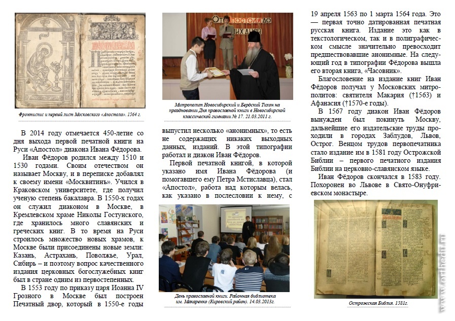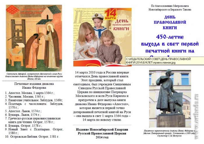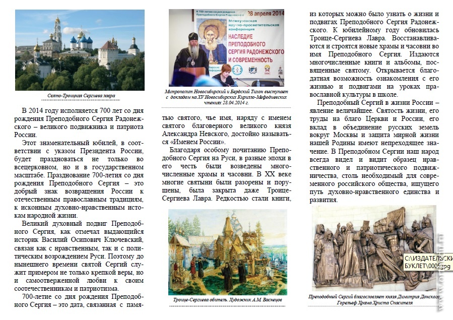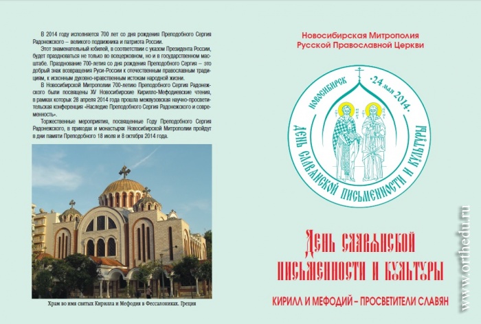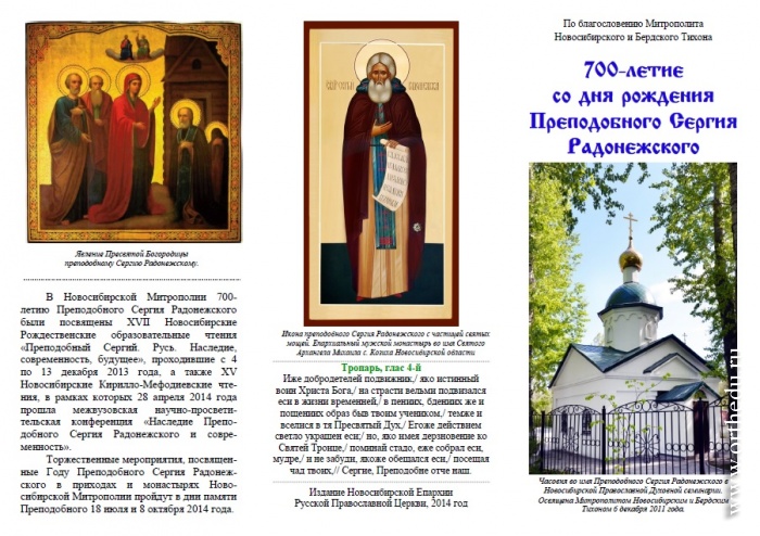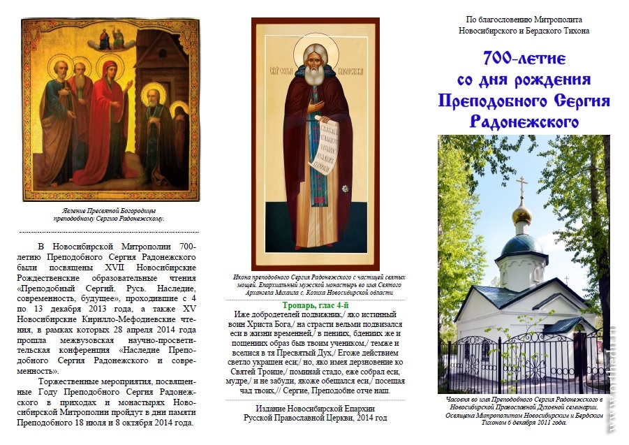 Издательством Новосибирской Епархии выпушены информационные буклетыПо благословению Митрополита Новосибирского и Бердского Тихона в 2014 году Издательством Новосибирской Епархии были выпущены буклеты, посвященные 700-летию со дня рождения Преподобного Сергия Радонежского, 450-летию выхода в свет первой печатной книги на Руси "Апостол" и Дню славянской письменности и культуры.