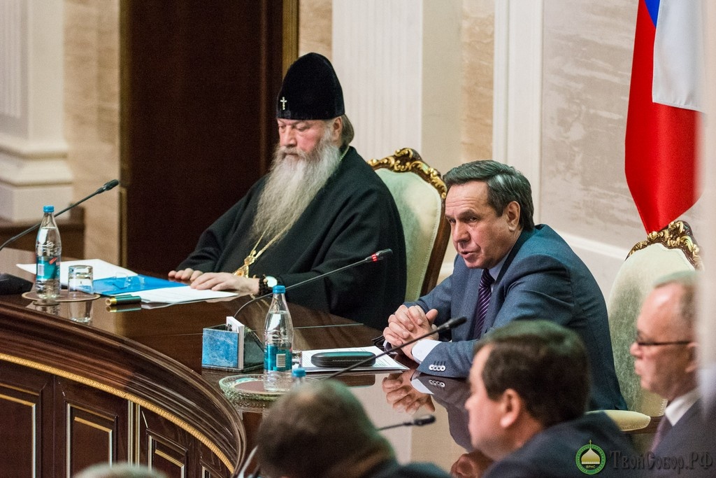 Председатель Законодательного собрания Новосибирской области Иван Григорьевич Мороз отметил важность уходящего 2014 года, в котором прошли масштабные торжества, посвященные 700-летию Преподобного Сергия Радонежского. Иван Григорьевич рассказал о своем участии в Парламентских встречах в Совете Федерации в Москве в январе 2014 года под председательством Патриарха Московского и всея Руси Кирилла. Он также напомнил о патриотическом подъеме в стране в связи с присоединением к России Крыма и Севастополя, а также важность грядущих юбилеев - 1000-летия кончины князя Владимира и 70-летия Победы в Великой Отечественной войне: "Это даты духовного союза народов России". Иван Григорьевич подчеркнул, что для многонациональной России главное - единство, поэтому необходимо помогать братским народам, оказавшимся в беде.