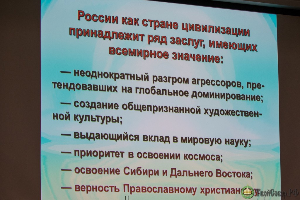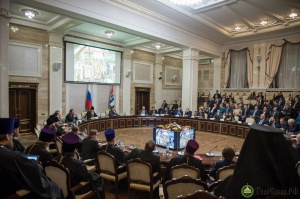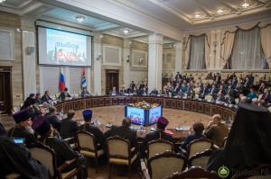 Митрополит Тихон в своем докладе "Цивилизационный выбор Руси" говорил об особой роли Российской цивилизации как одного из ведущих полюсов многополярного мира. "России как стране-цивилизации принадлежит внушительный ряд заслуг, имеющих всемирное значение: неоднократный разгром агрессоров, претендовавших на глобальное доминирование, создание общепризнанной художественной культуры, выдающийся вклад в мировую науку, приоритет в освоении космоса, освоение Сибири и Дальнего Востока, верность Православному христианству, - сказал Владыка. - Отцом нашей цивилизации является святой князь Владимир. Рождением нашей цивилизации мы считаем 988 год - год Крещения Руси".