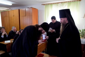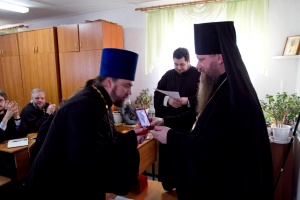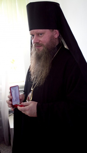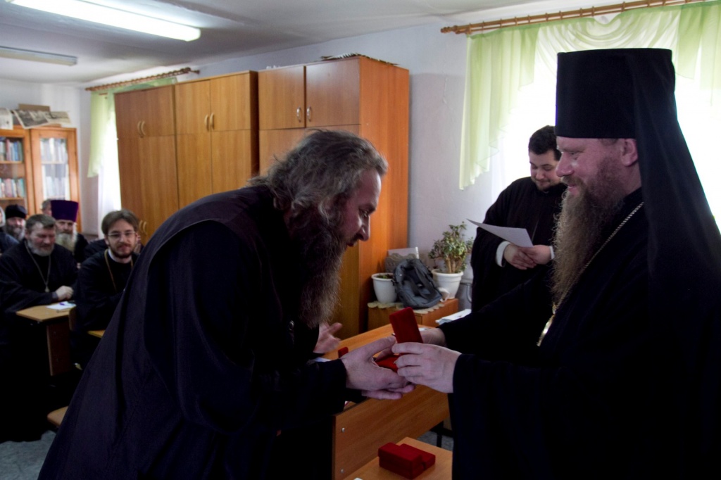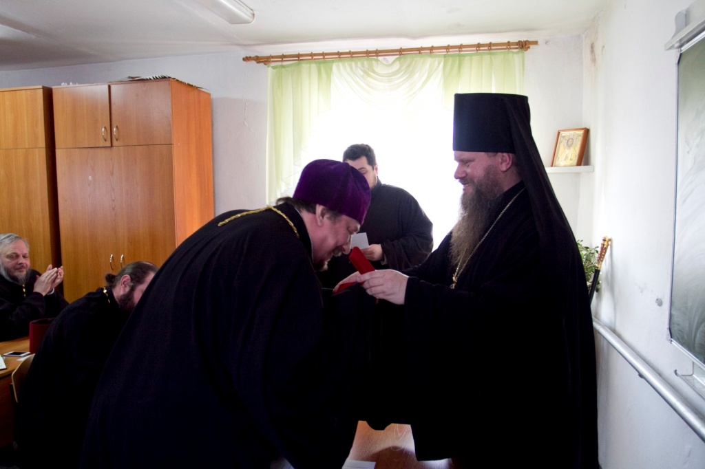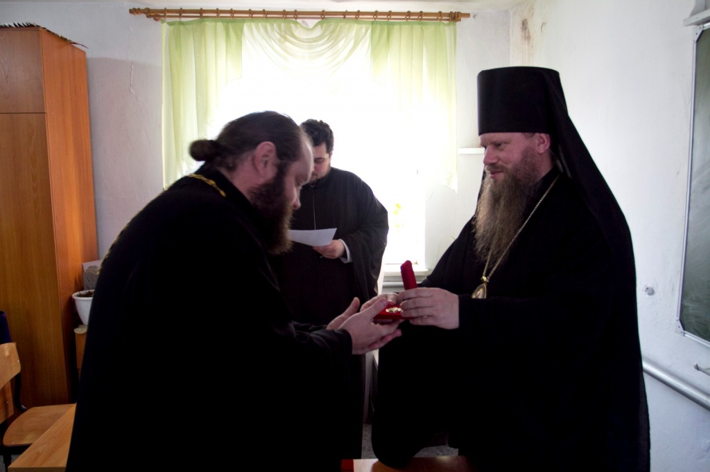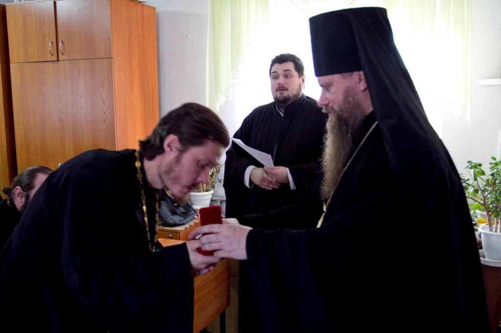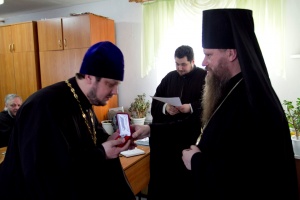 В заключении архипастырь отметил особо потрудившихся клириков Искитимской епархии митрополичьим знаком "90-летие Новосибирской епархии":